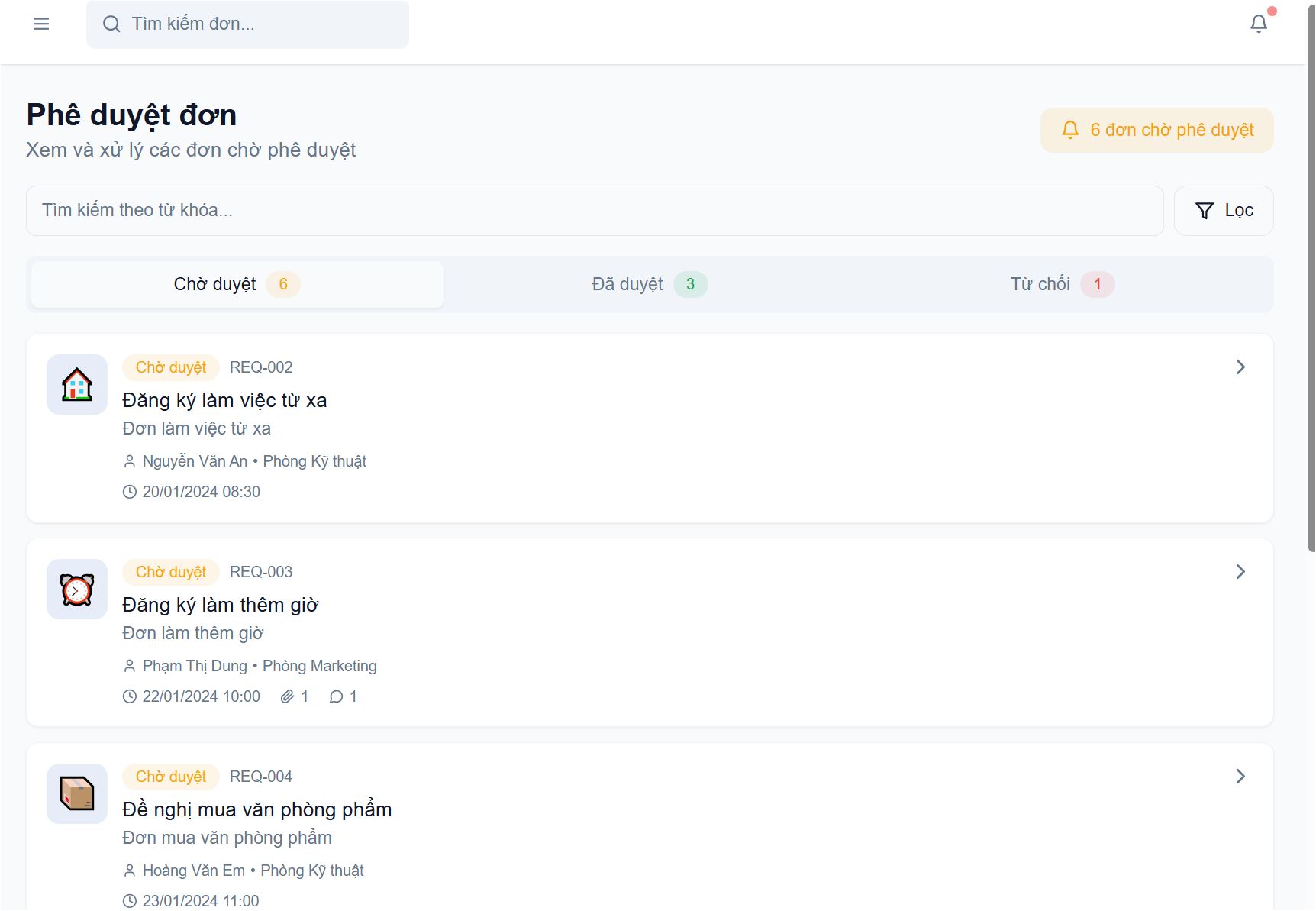 Người quản lý dễ dàng theo dõi các Đơn đề nghị đang chờ duyệt, đã duyệt, bị từ chối, tránh thất lạc hoặc xử lý trùng lặp.