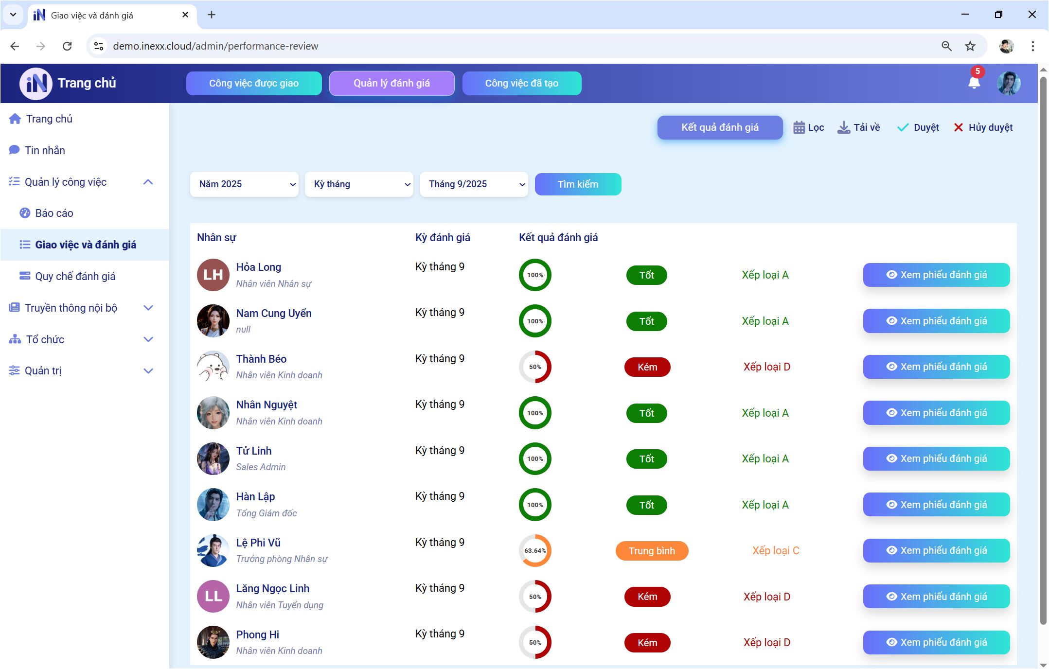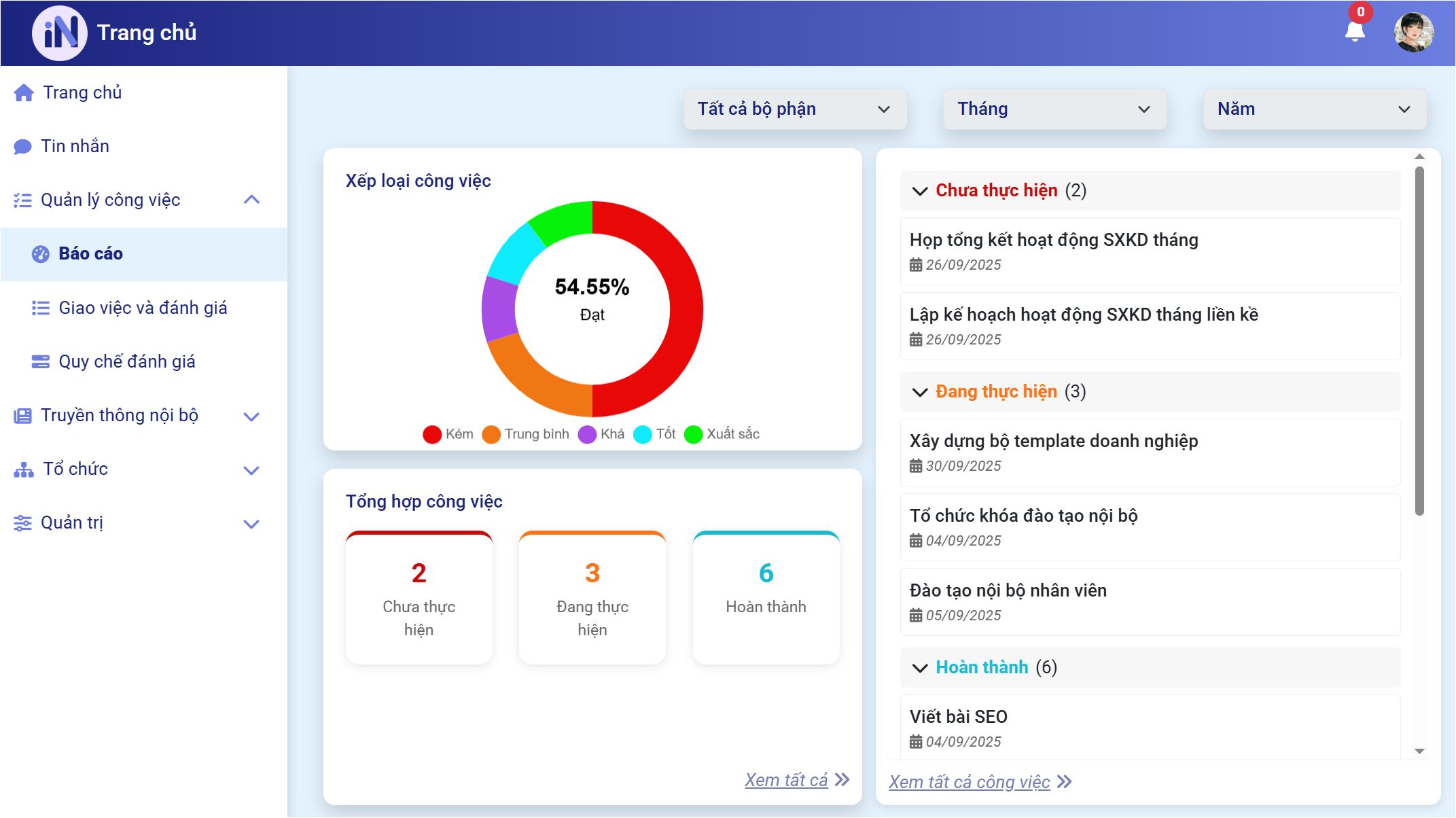 iNexxWork cho phép doanh nghiệp quản lý tiến độ công việc chi tiết, từ lập kế hoạch, phân công đến theo dõi thực hiện. Hệ thống hỗ trợ đánh giá công việc dựa trên tiêu chí cụ thể, tự động tạo phiếu đánh giá, ghi nhận nhận xét và thảo luận trực tiếp trên từng nhiệm vụ. Nhờ đó, tăng tính minh bạch, nâng cao trách nhiệm và hiệu quả làm việc của đội ngũ.